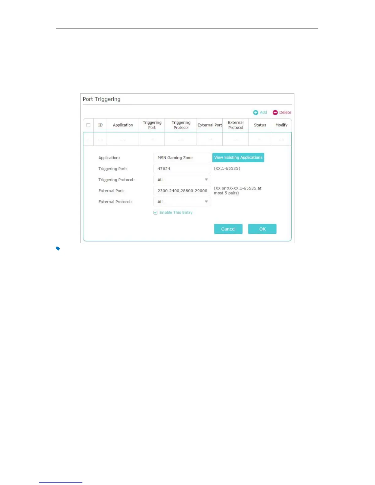 • You can add multiple port triggering rules according to your network need.