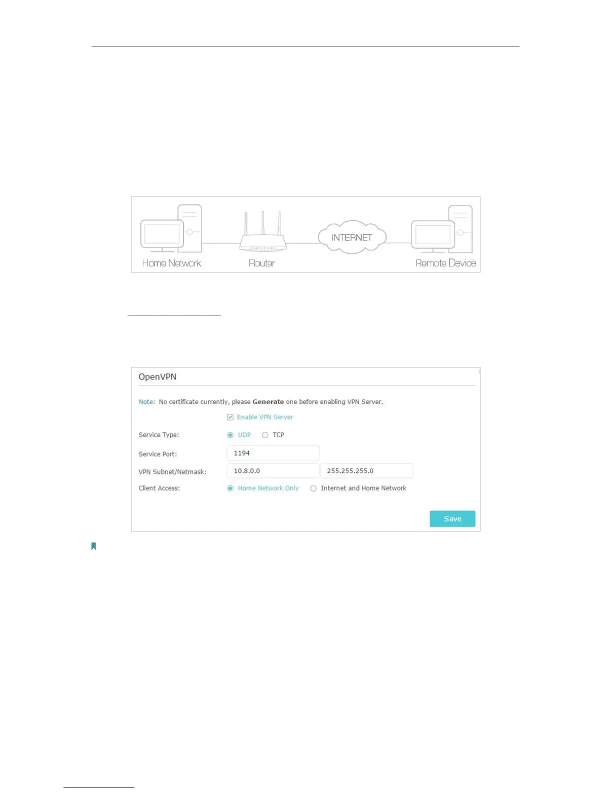 • The first time you configure the OpenVPN Server, you may need to Generate a certificate before you enable the VPN