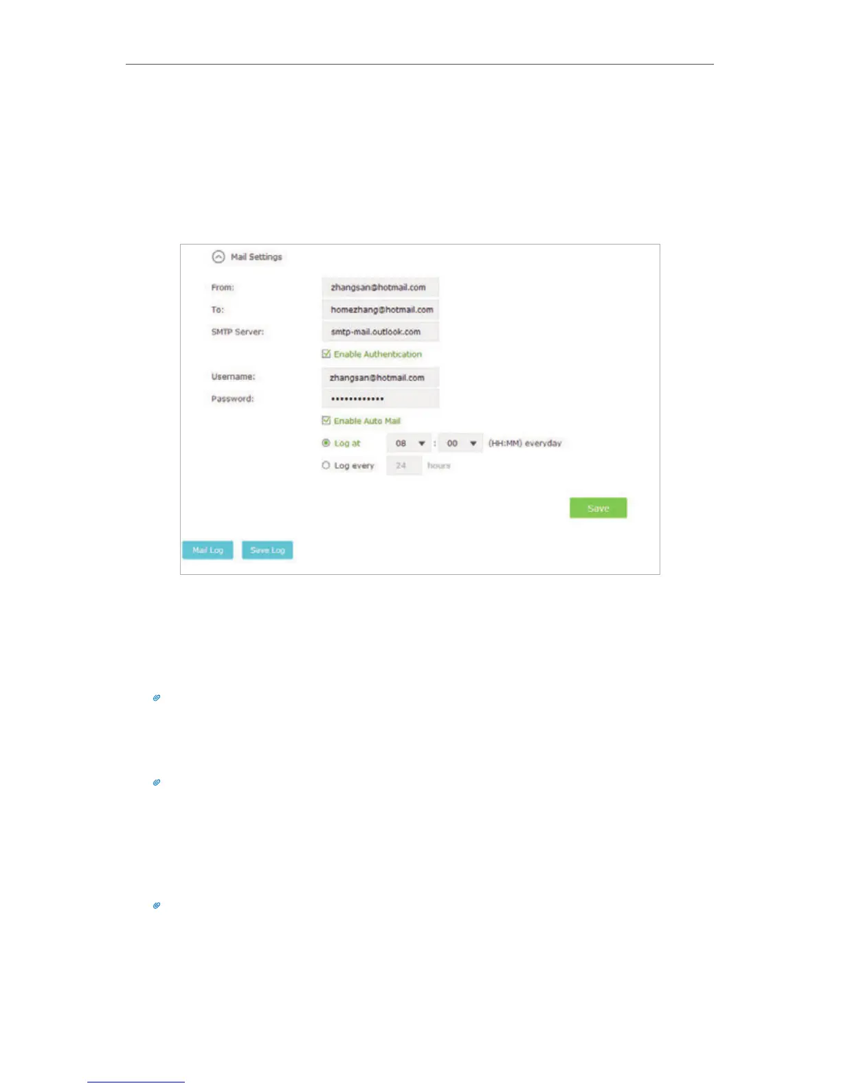Tips: The router will send the system log to the designated email address if this option is enabled.