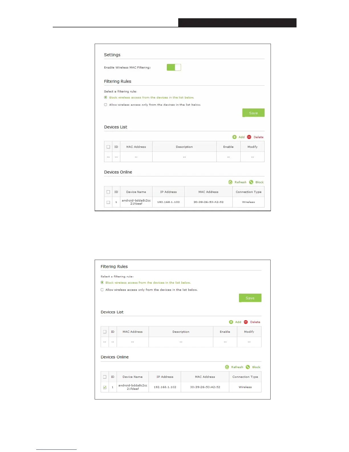 2) Select the device(s) to be blocked in the Devices Online table.