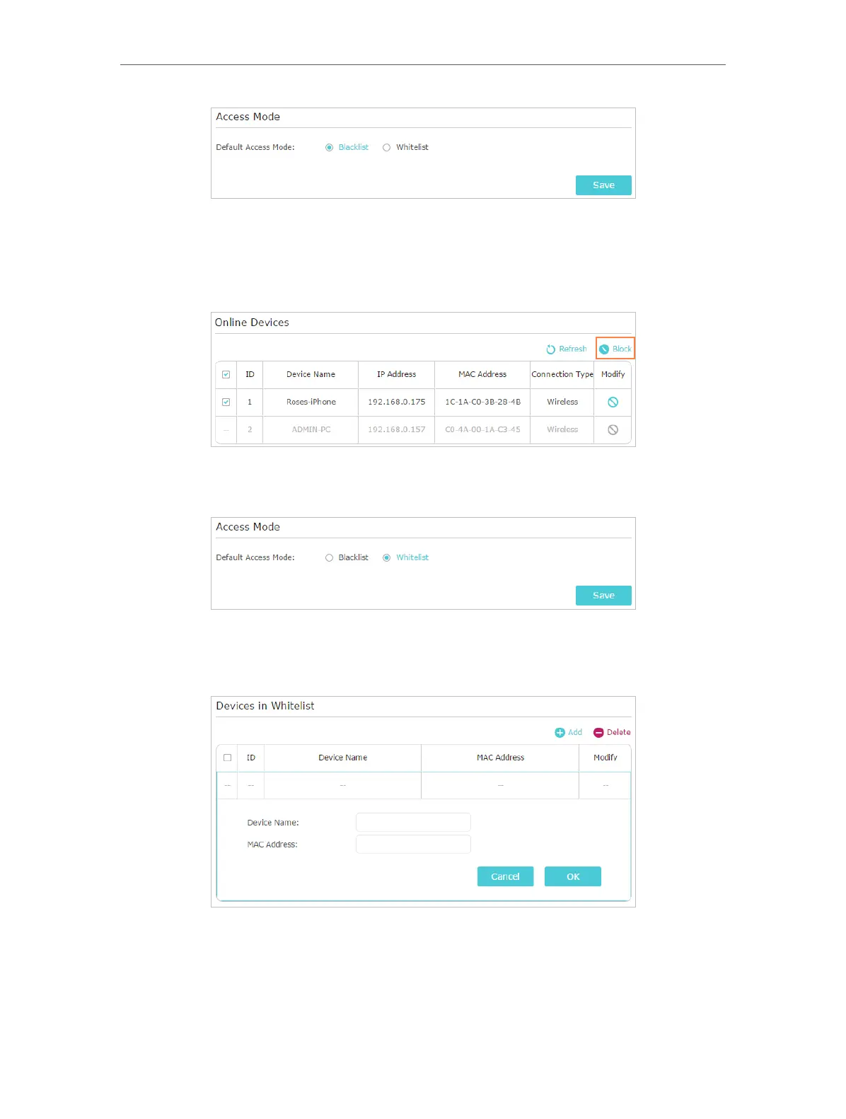 2 ) Click Add in the Devices in Whitelist section. Enter the Device Name and MAC