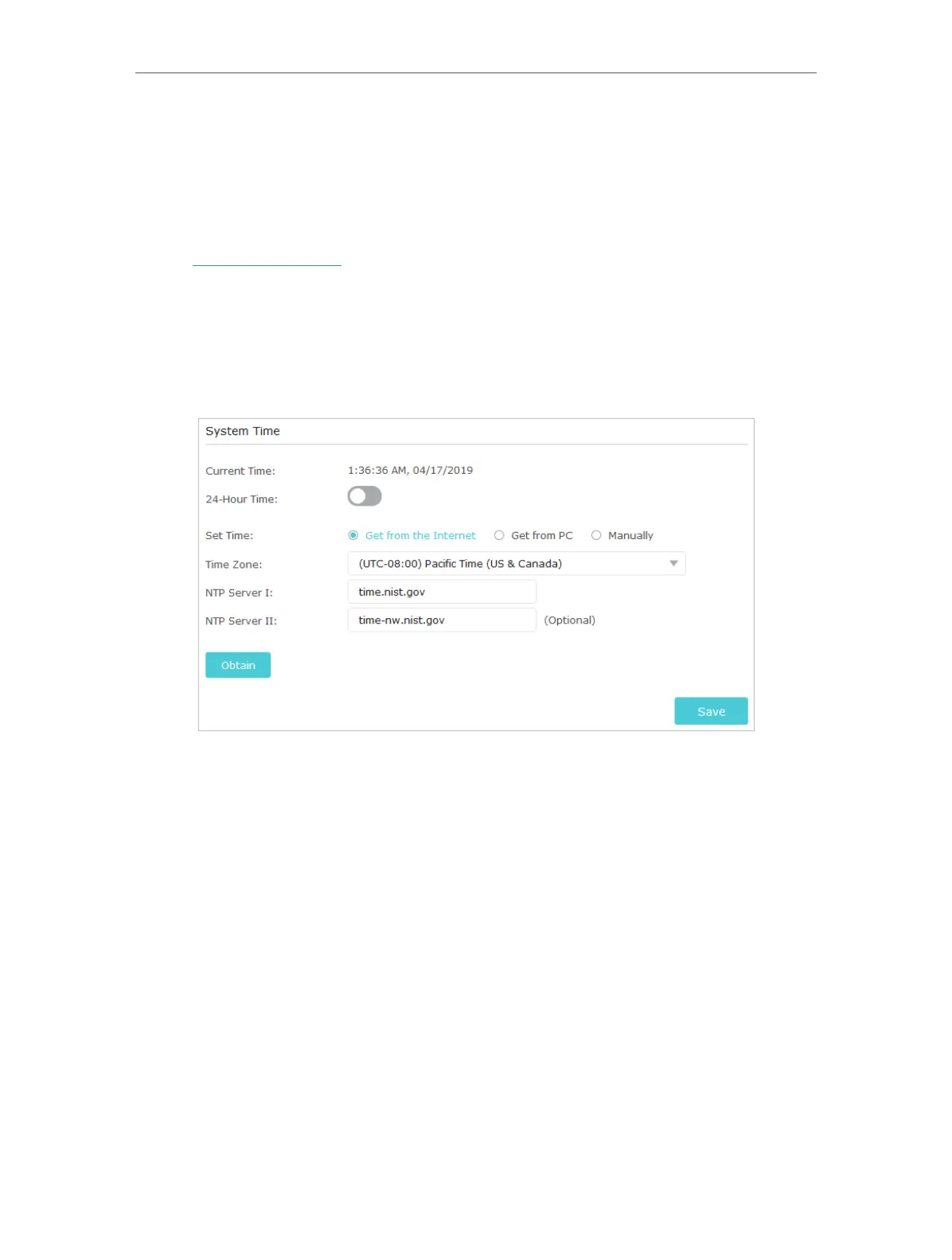 5. Click Obtain to get the current Internet time and click Save.