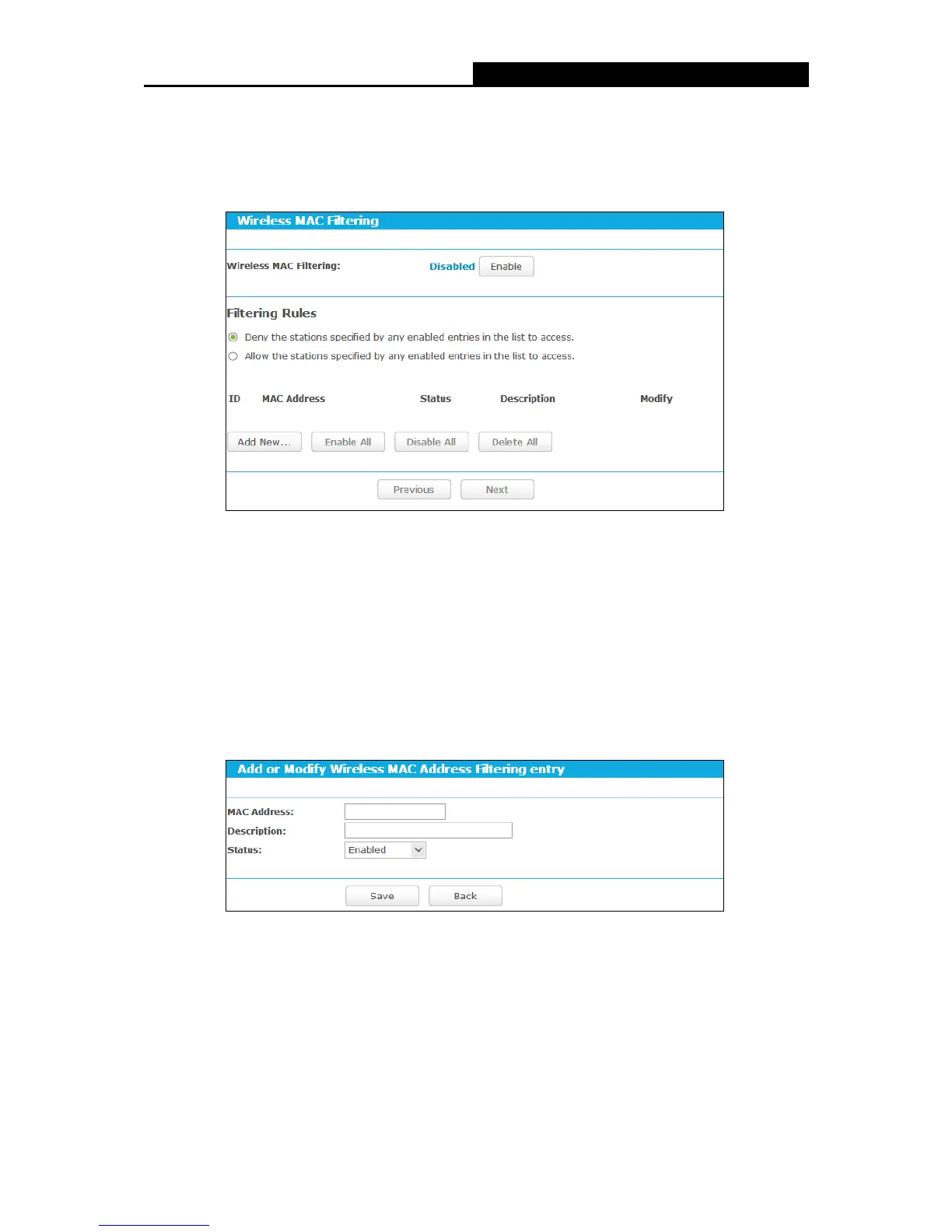 Wireless MAC Address Filtering entry" page will appear, shown in Figure 5-22.
