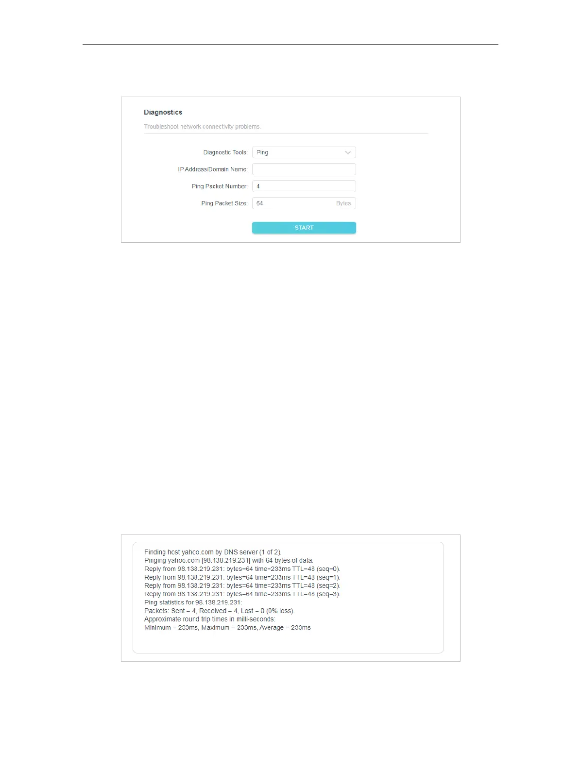 • Ping is used to test the connectivity between the router and the tested host,