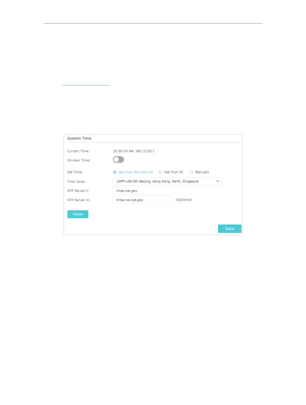 5. Click Obtain to get the current Internet time and click Save.