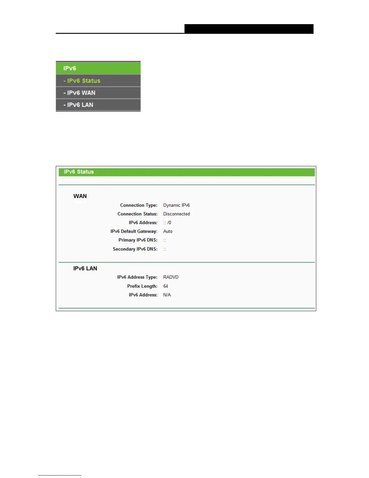 There are three submenus under the IPv6 Support menu: IPv6 Status, IPv6 WAN and IPv6 LAN.