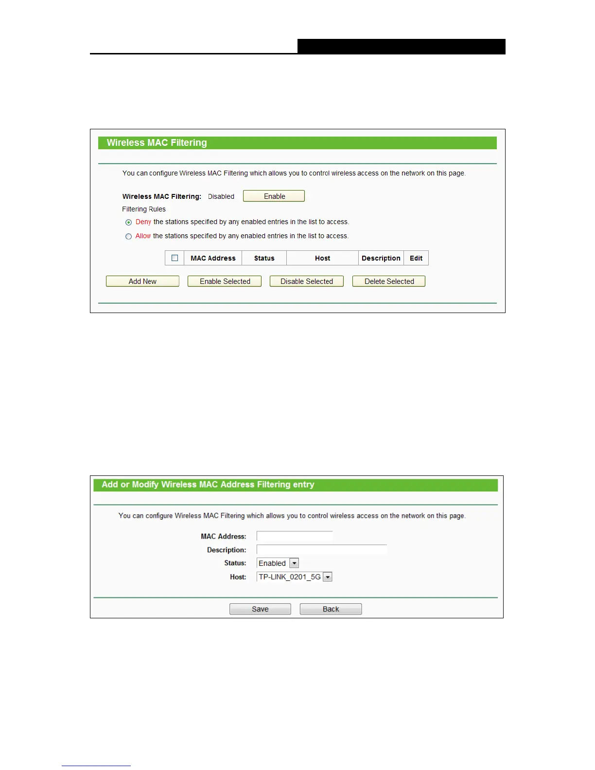To add or modify a MAC Address Filtering entry, follow these instructions:
