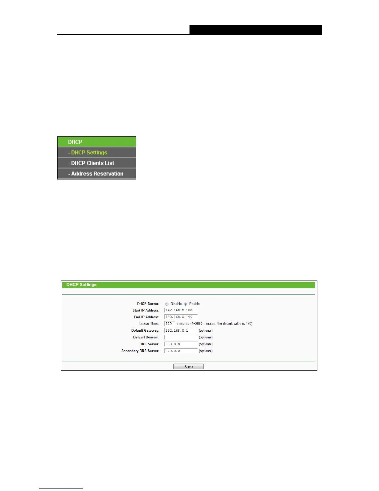 DHCP Settings”, you can configure the DHCP Server on the page as