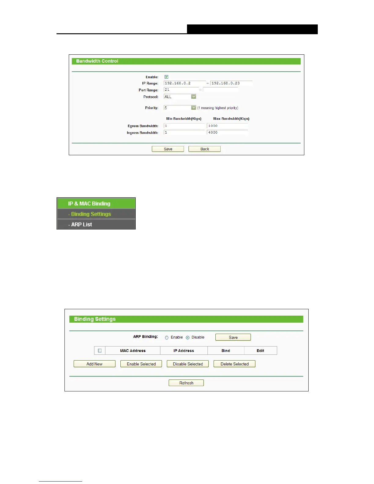 There are two submenus under the IP &MAC Binding menu: Binding Settings and ARP List.