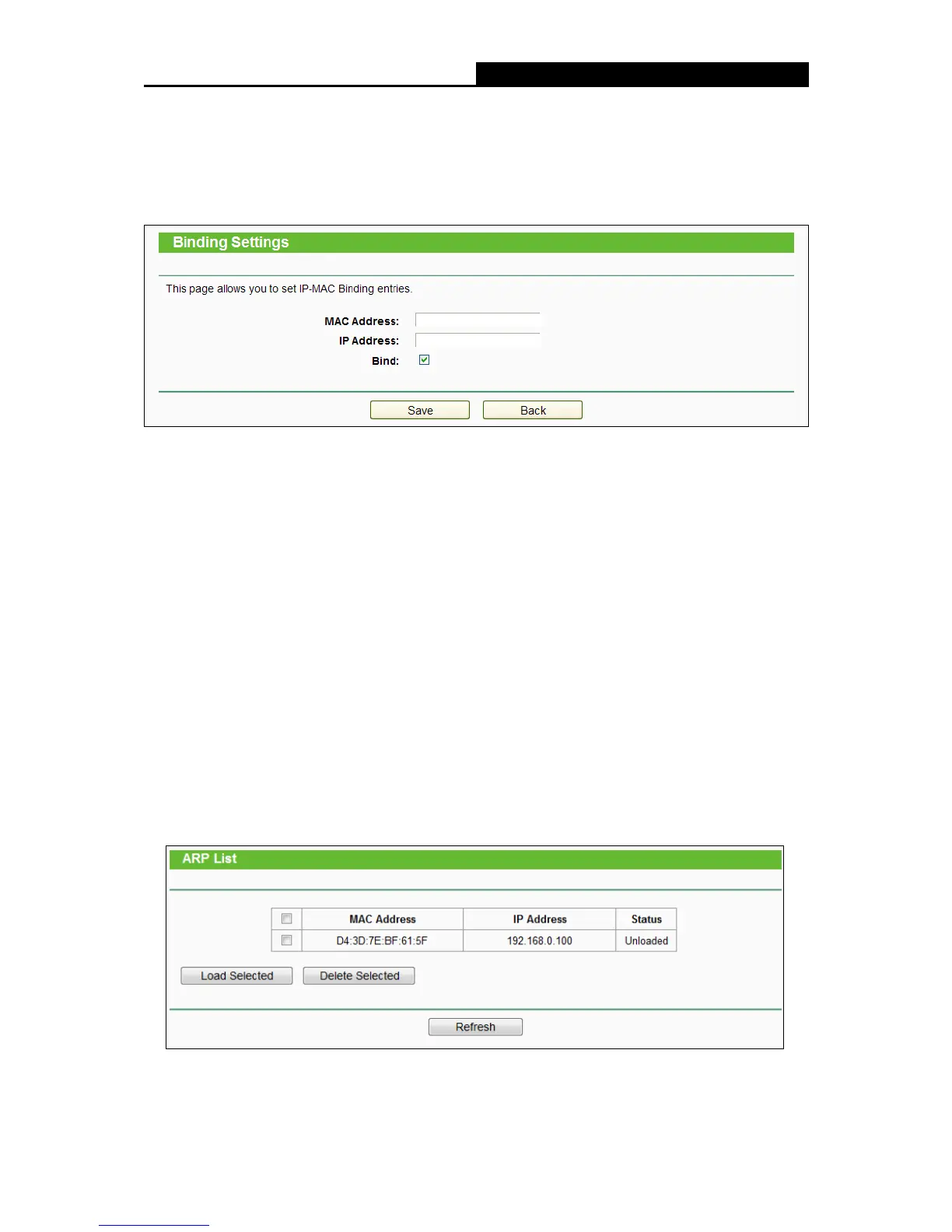 items on the ARP list. This page displays the ARP List; it shows all the existing IP & MAC Binding