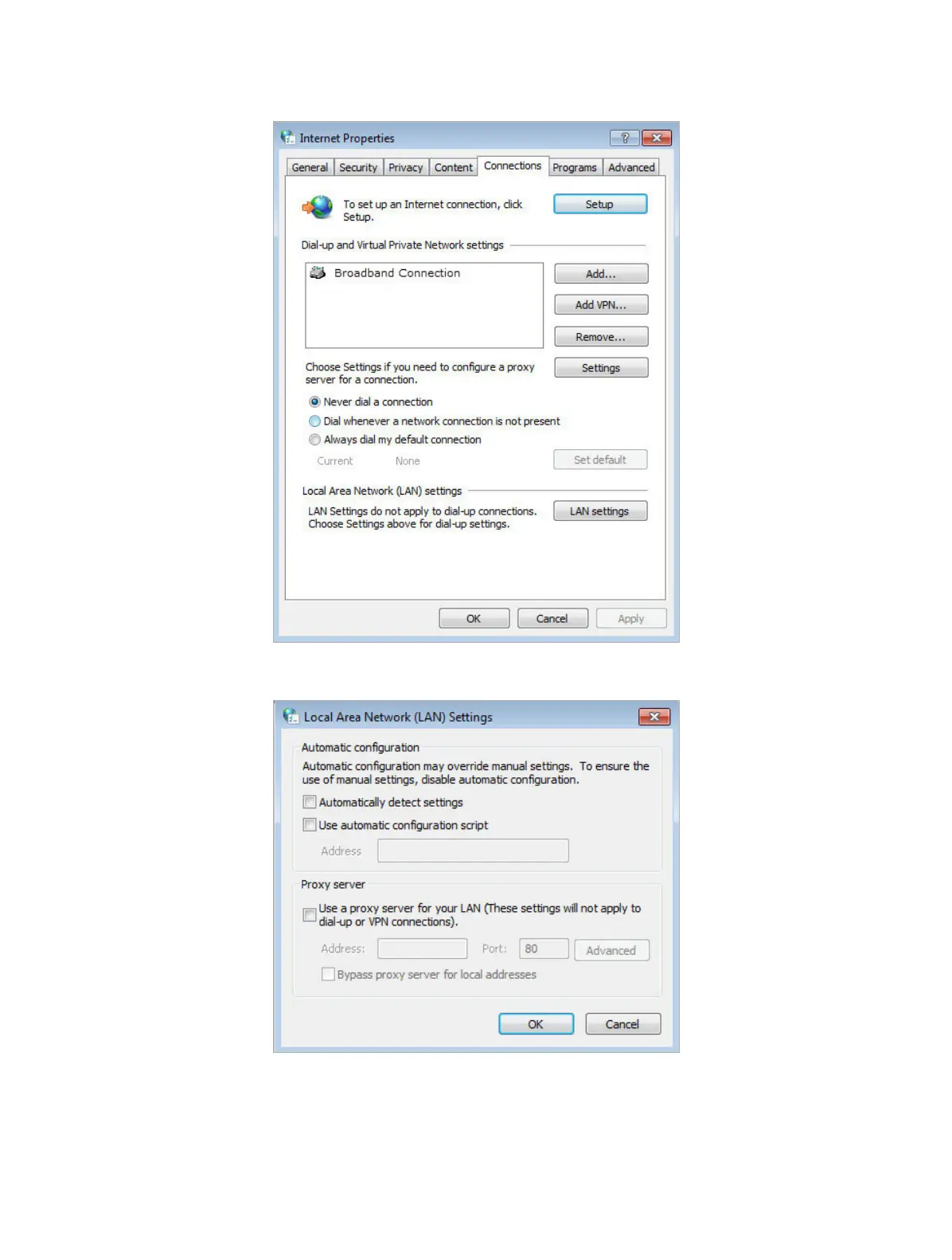 4 ) Click LAN settings and deselect the following three options and click OK.