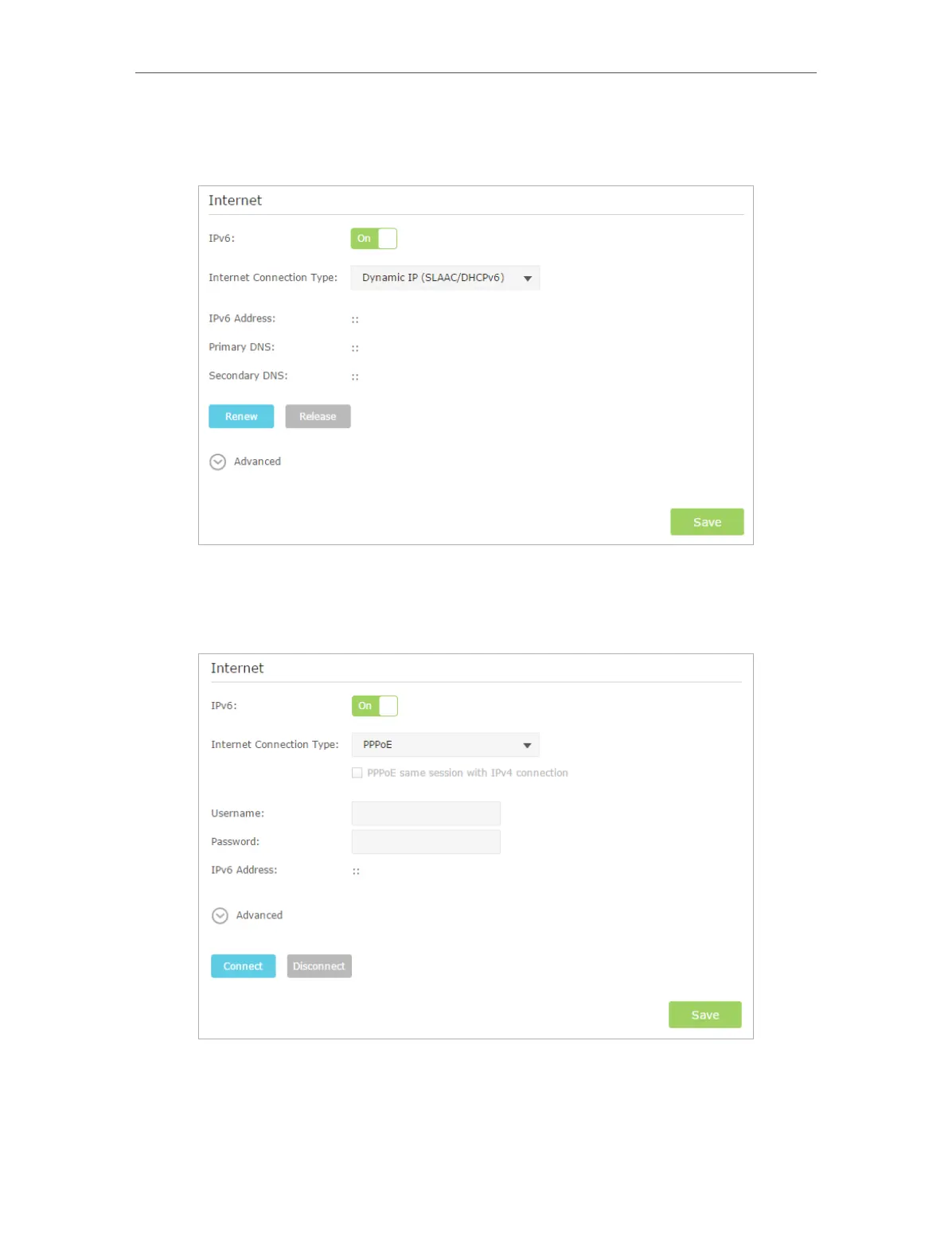 2 ) Dynamic IP(SLAAC/DHCPv6): Click Advanced to do more configuration if your