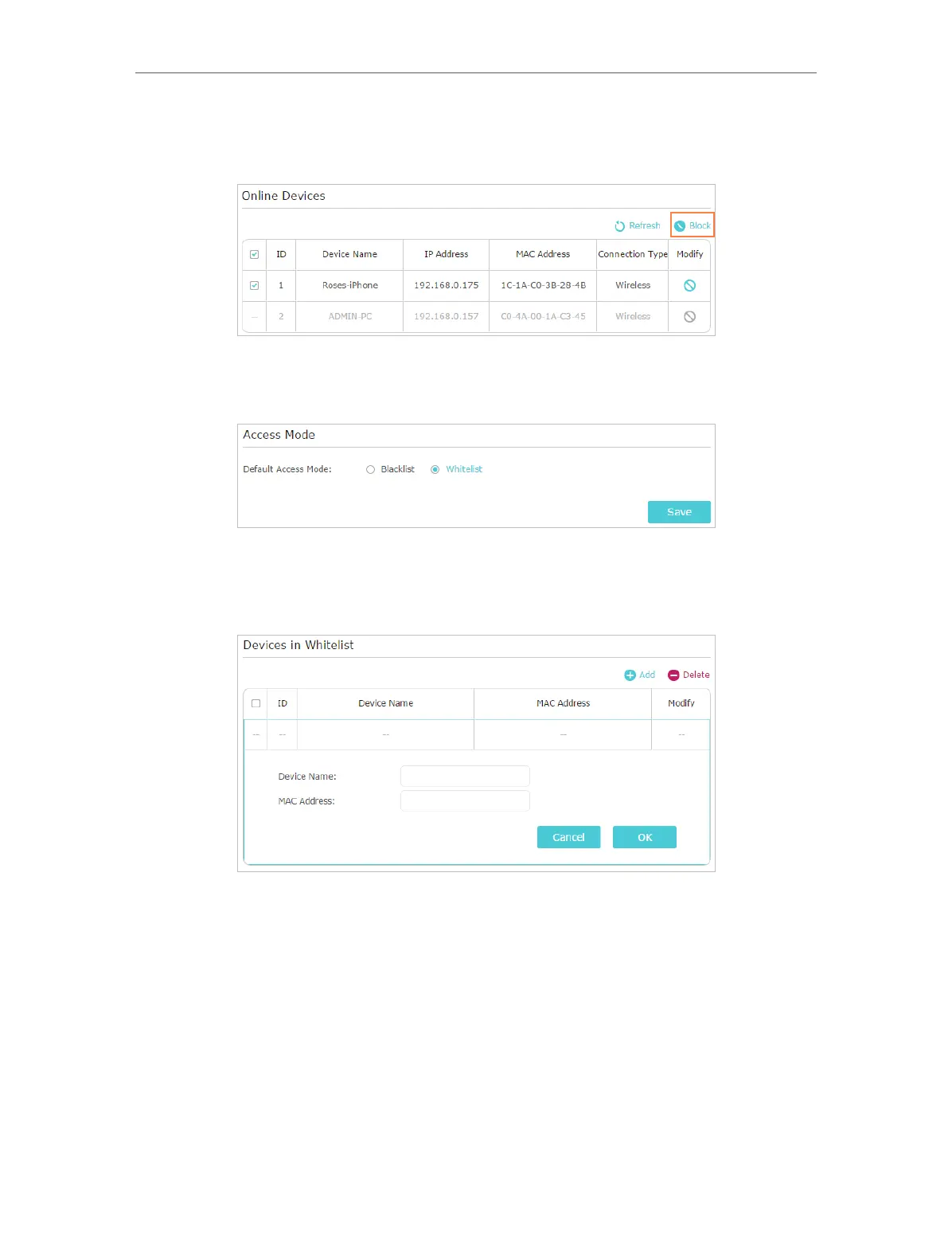2 ) Click Add in the Devices in Whitelist section. Enter the Device Name and MAC