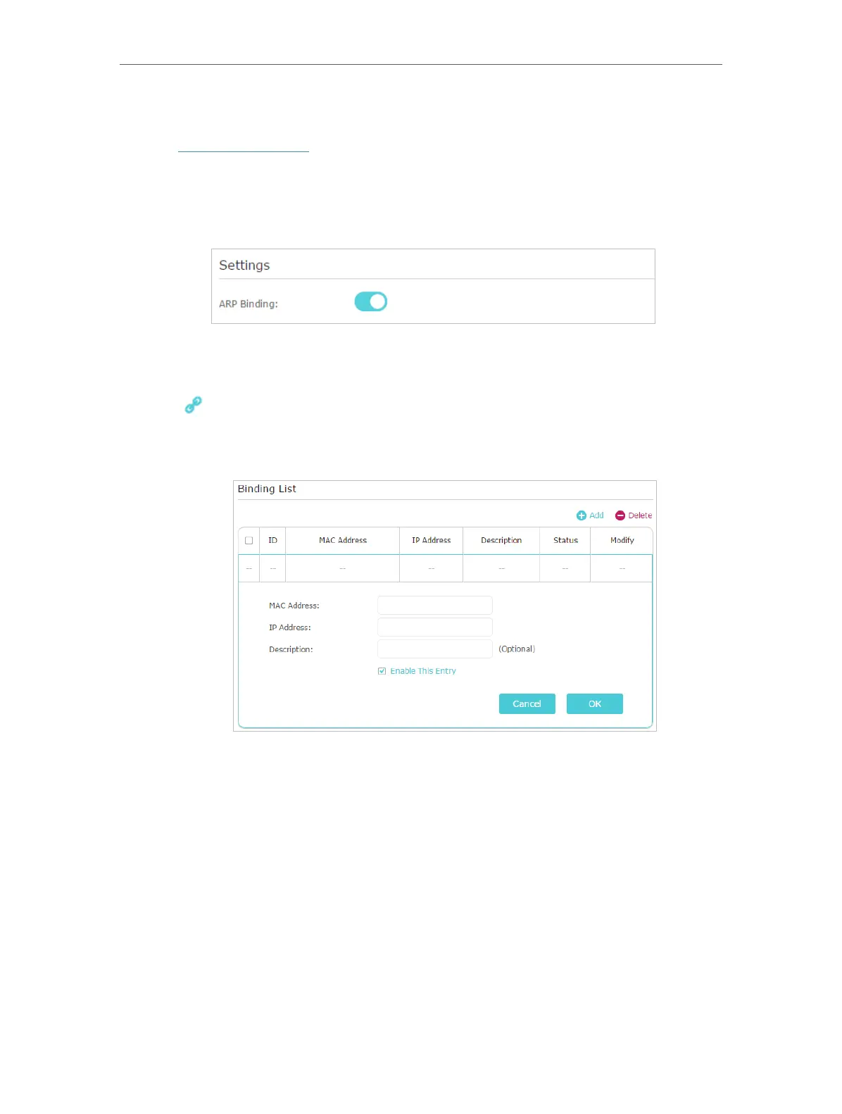 2 ) Enter the MAC address and IP address that you want to bind. Enter a Description