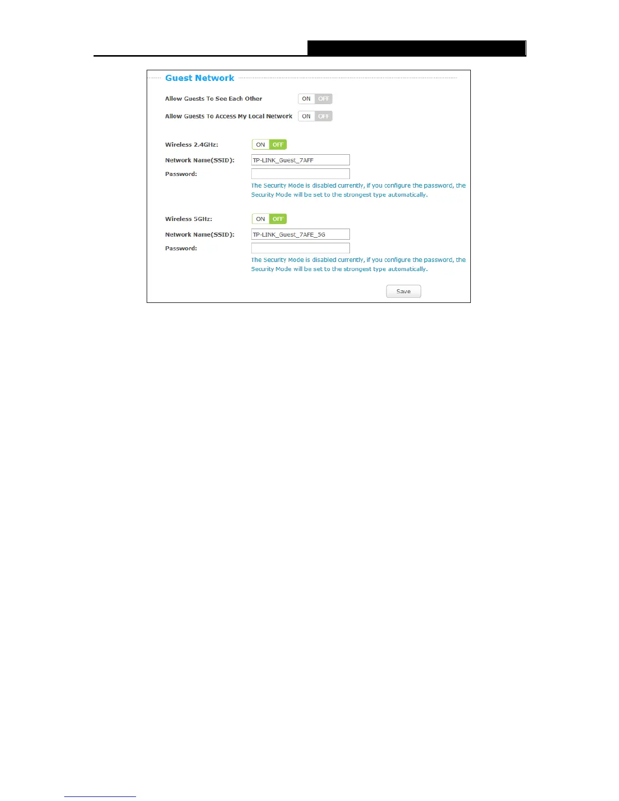 select OFF to disable guest wireless 2.4GHz/5GHz network.