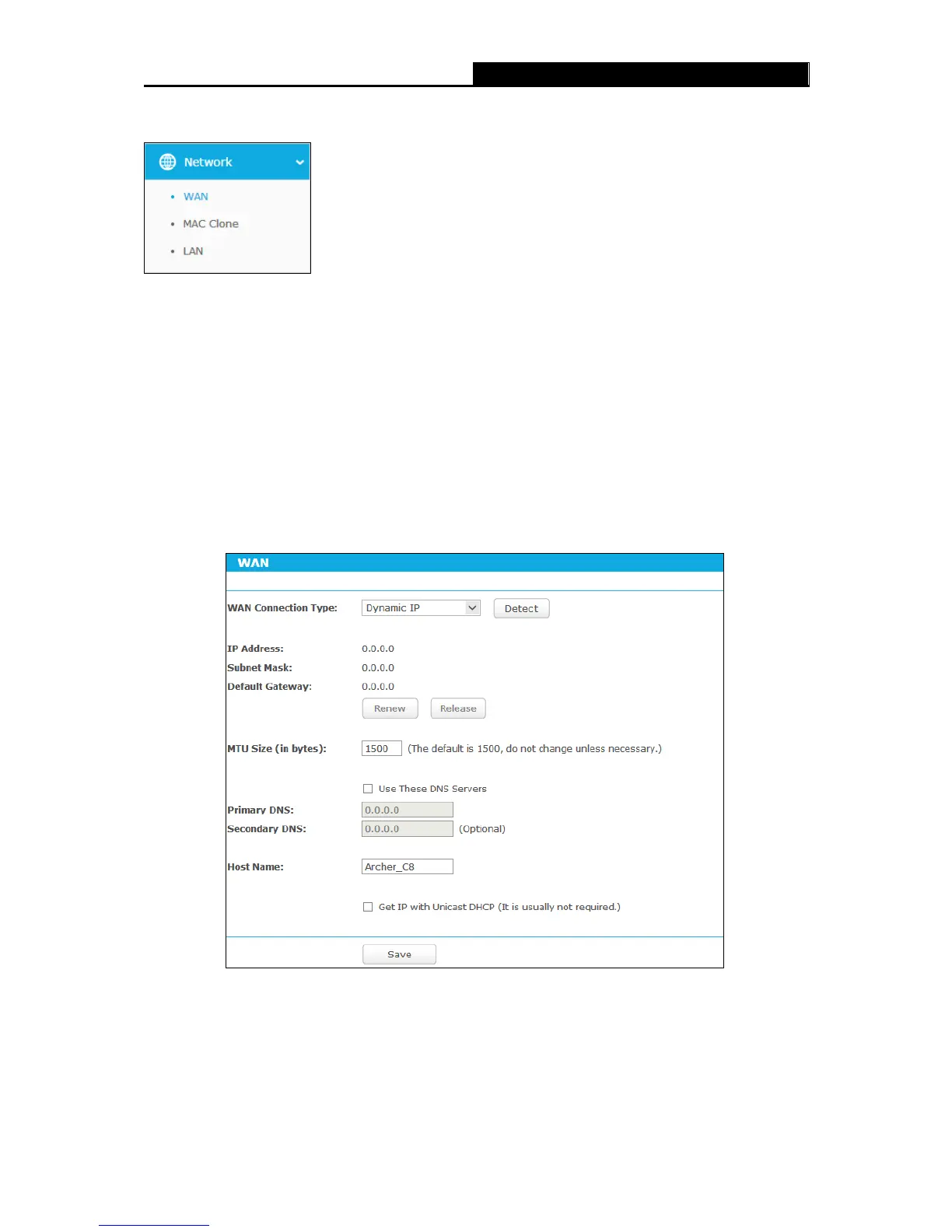 There are three submenus under the Network menu as shown in Figure 5-2: WAN, MAC Clone