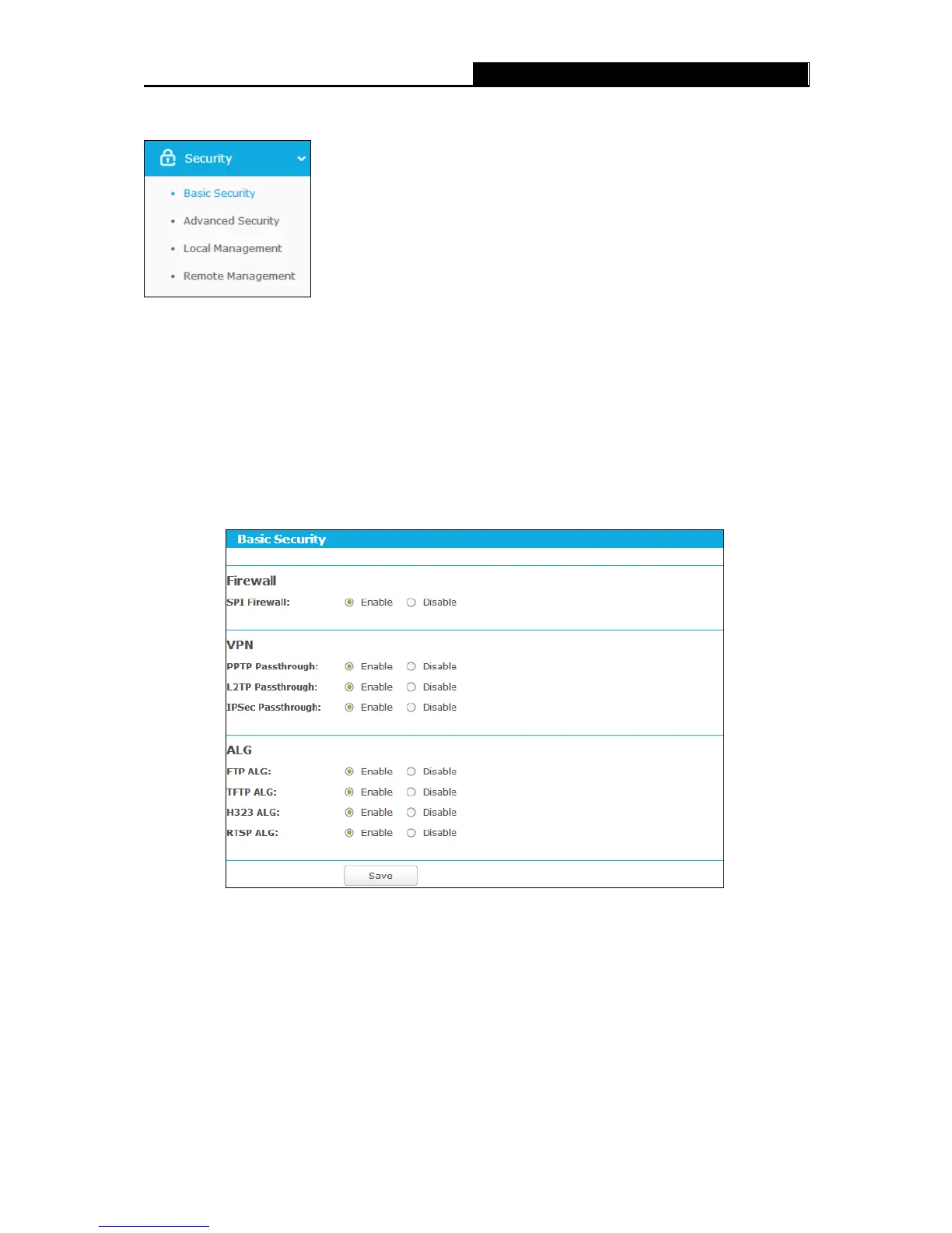 There are four submenus under the Security menu: Basic Security, Advanced Security, Local