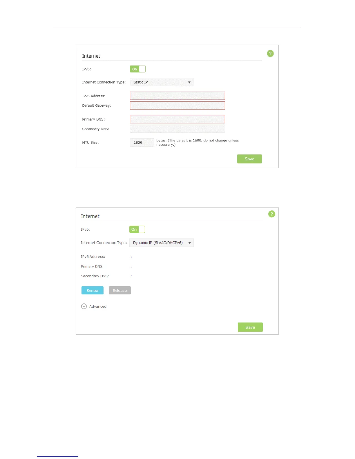 2 ) Dynamic IP(SLAAC/DHCPv6): Click Advanced to have more configuration if
