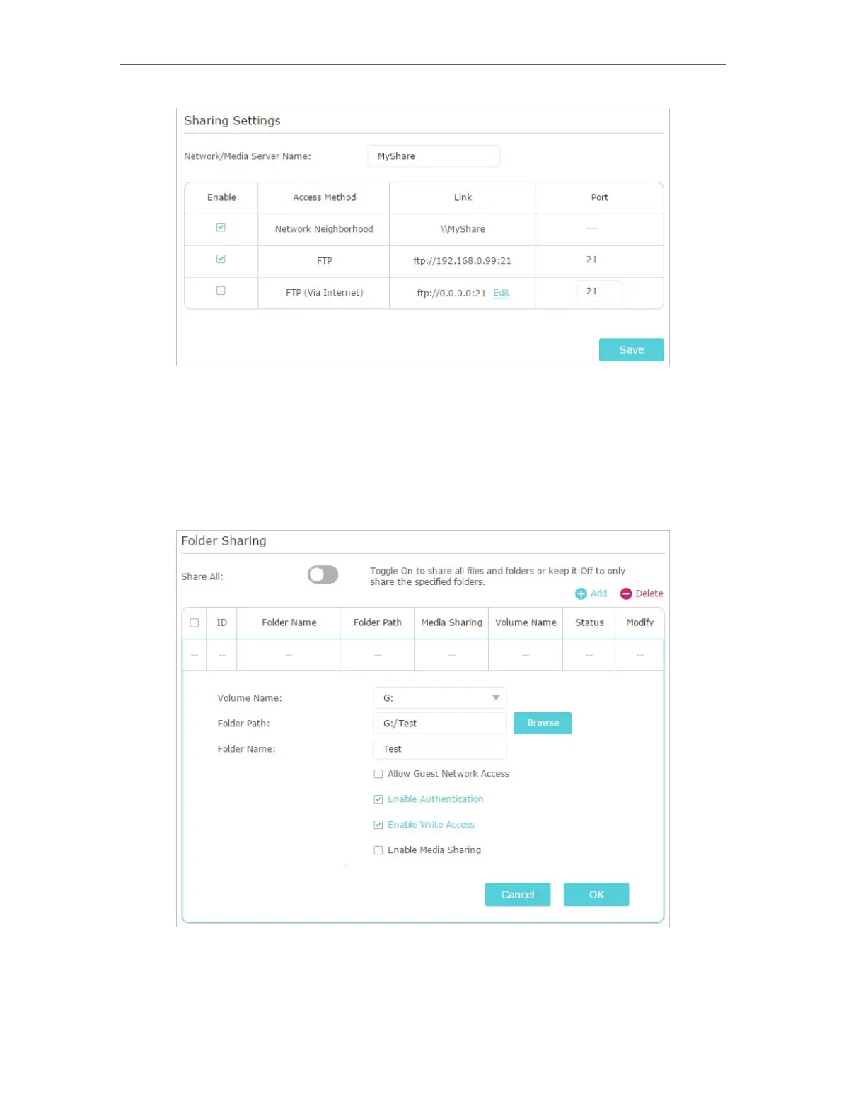 Add to add a new sharing folder.
