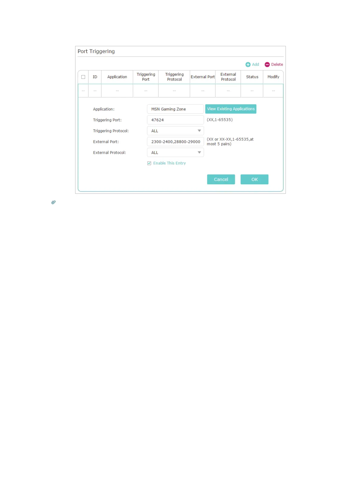 • You can add multiple port triggering rules according to your network need.