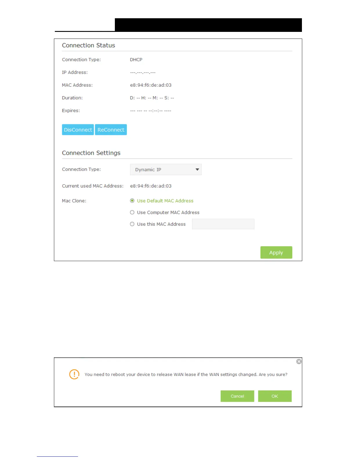 DisConnect - Click the DisConne ct button to release WAN lease, then the Note Dialog will
