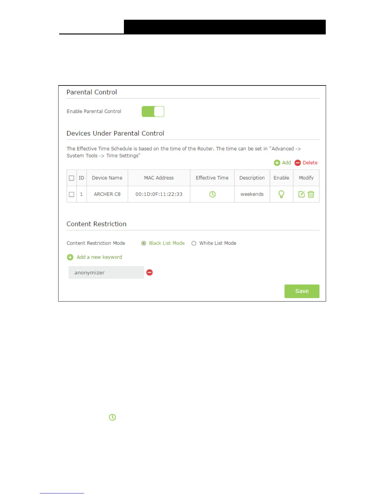 Add - You can add a new device for the parental control by clicking this button.