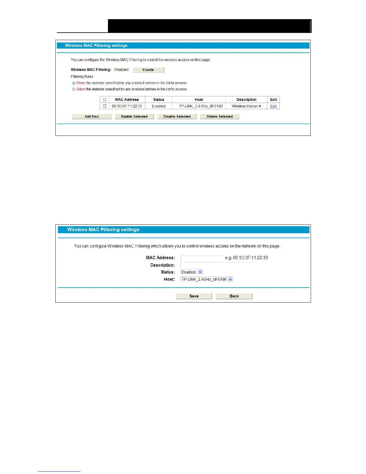 To add or modify a MAC Address Filtering entry, follow these instructions: