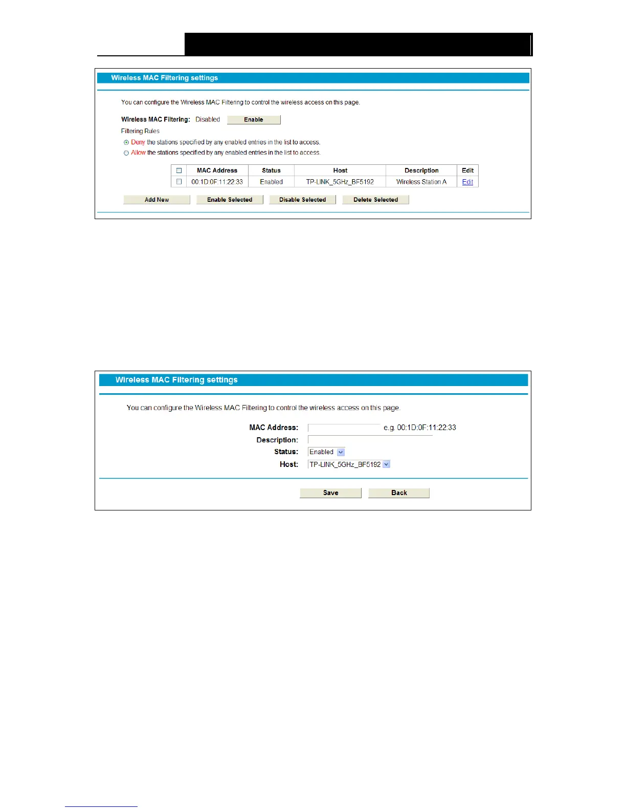 To filter wireless users by MAC Address, click Enable. The default setting is Disabled.