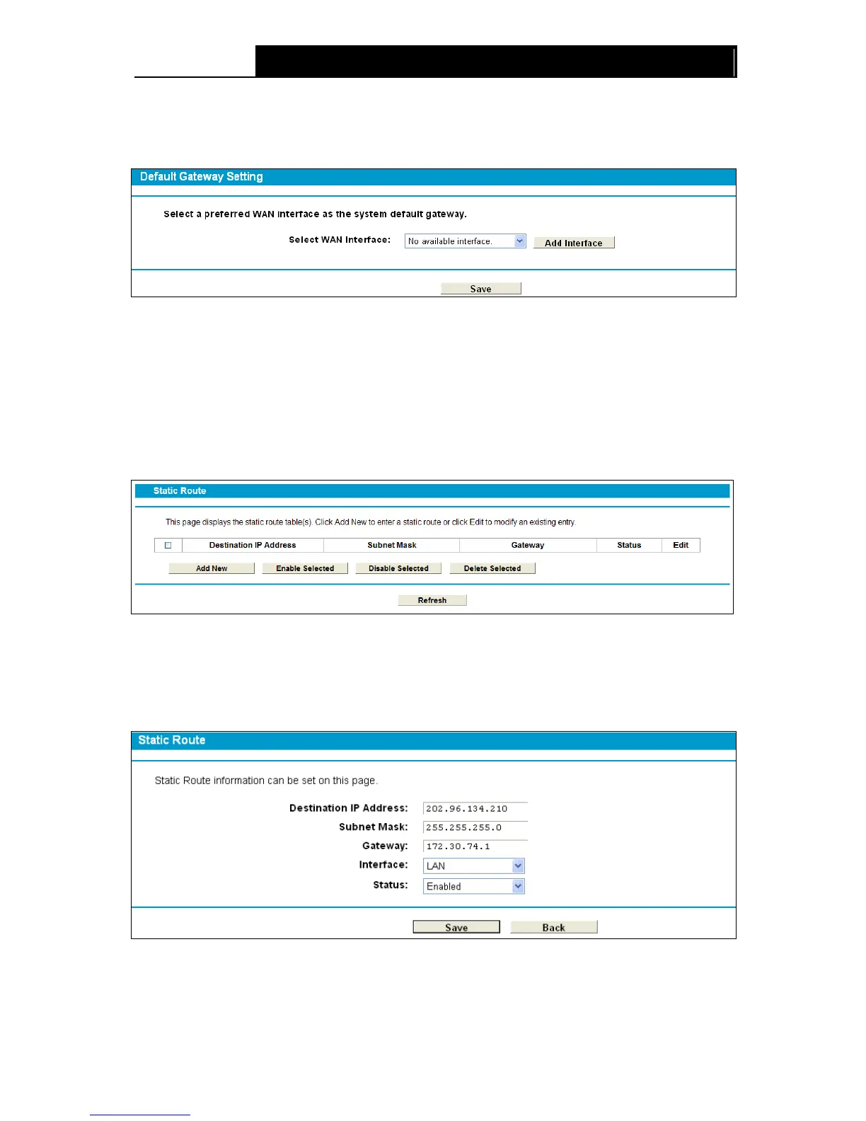 Choose “Route Settings”“Default Gateway”, you can see the Default Gateway screen. You
