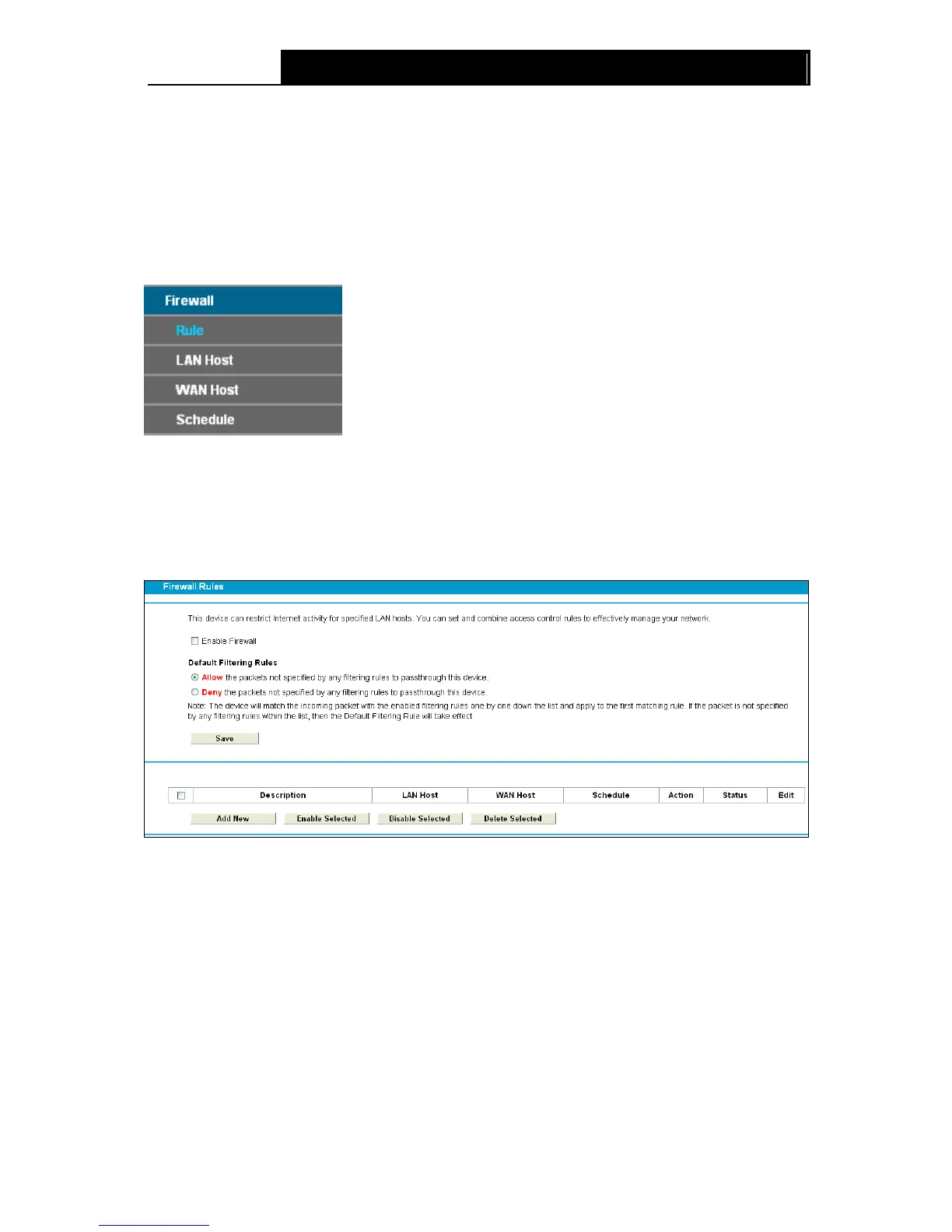 Enable Firewall: Select the check box to enable the Firewall function, so the Default Filtering