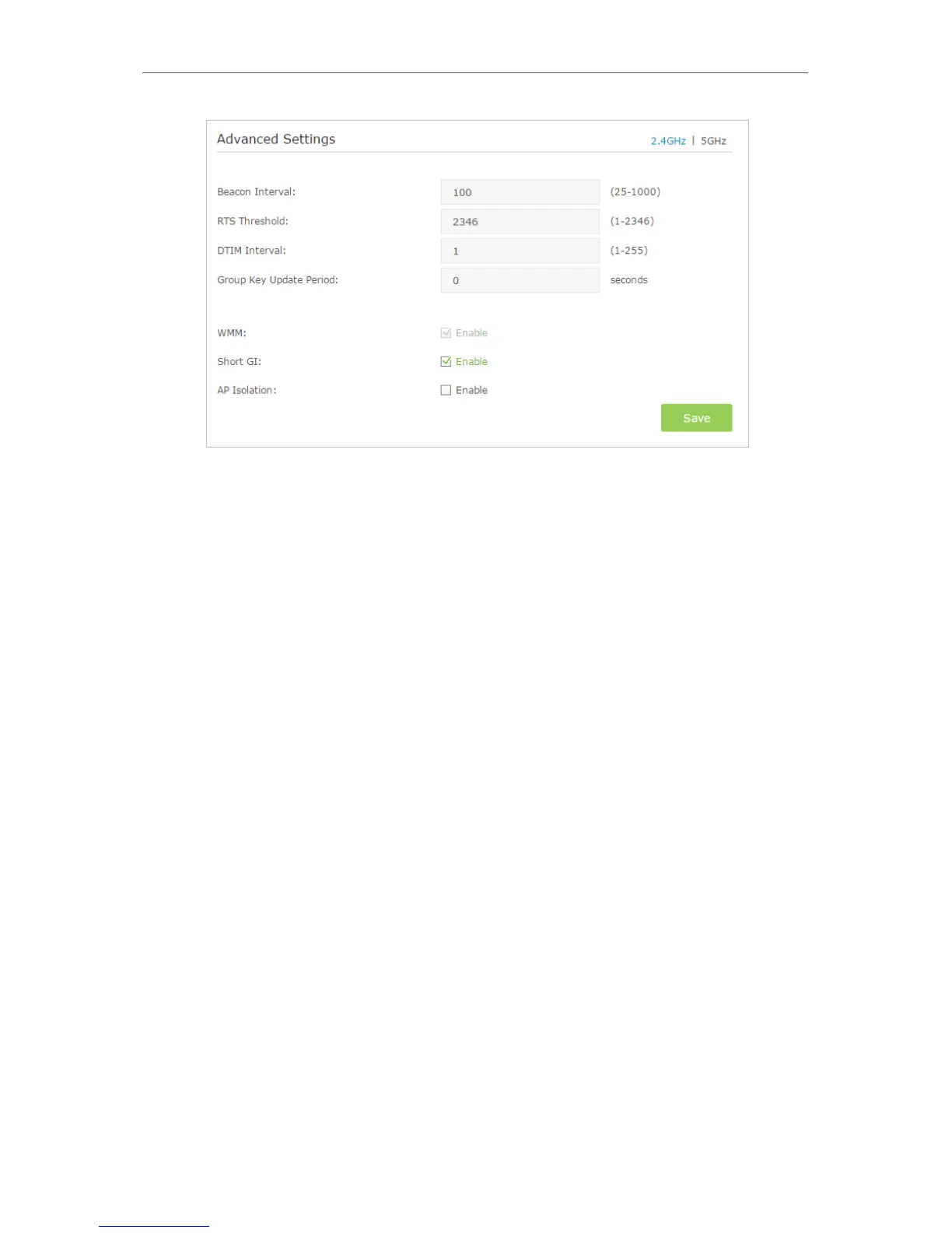 • Enable Short GI: This feature is enabled by default and recommended to increase the