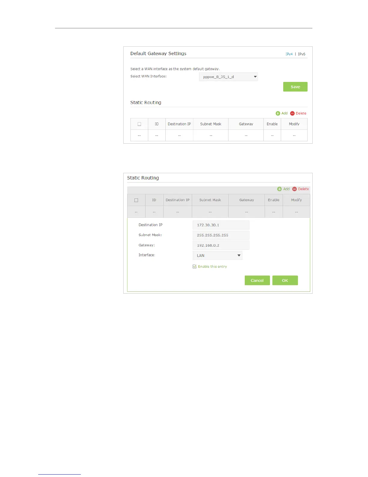 4. Click Add to add a new static routing entry. Finish the settings