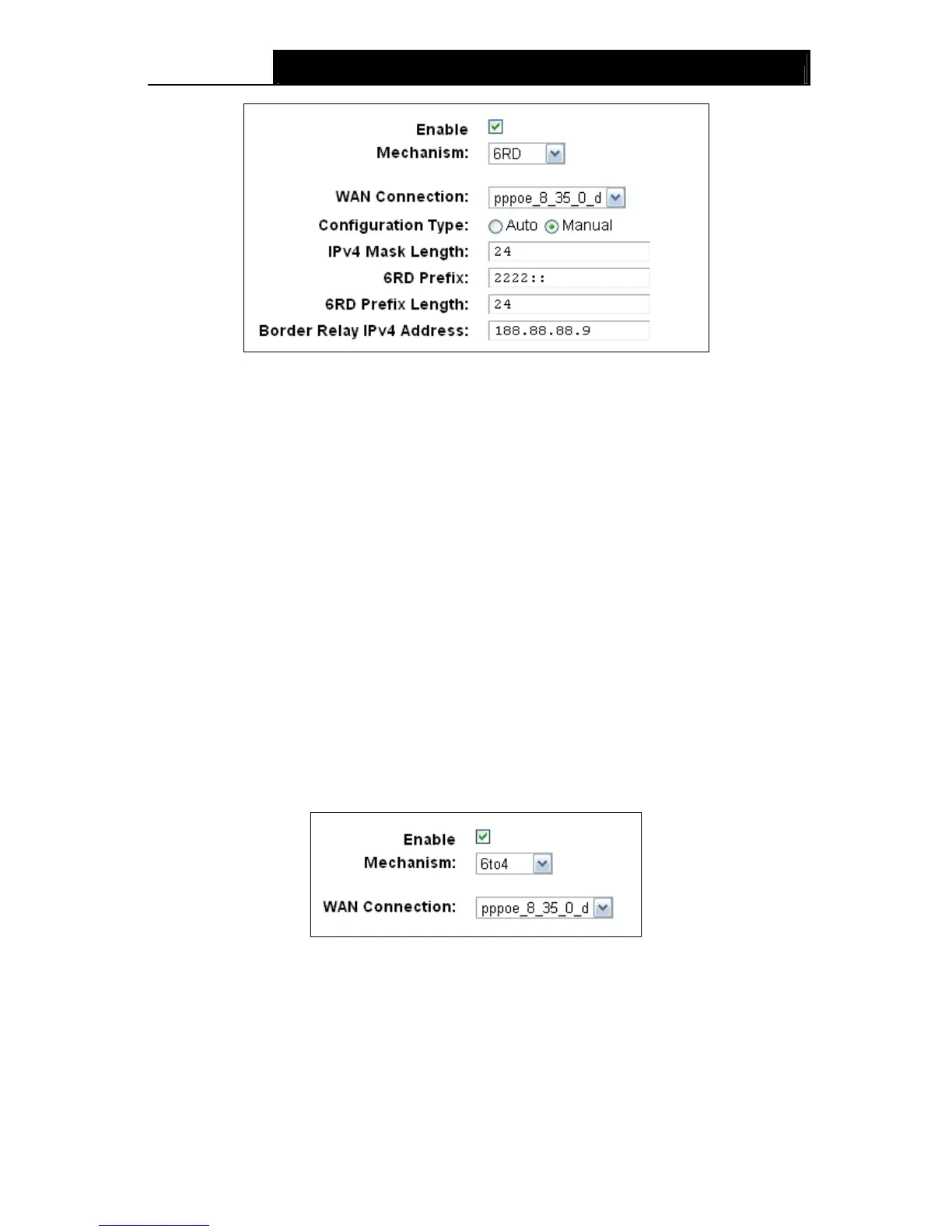 Border Relay IPv4 Address: The IPv4 address of the border relay router of 6RD tunnel.