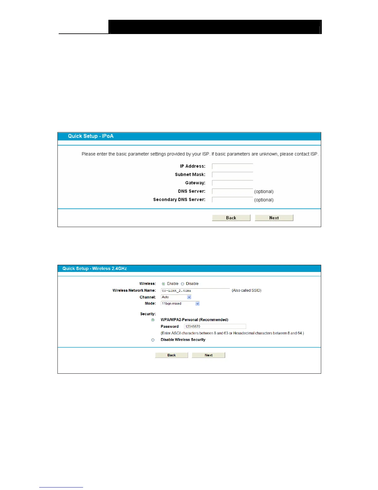 Enter the Static IP or IPoA information provided by your ISP, and then click Next.