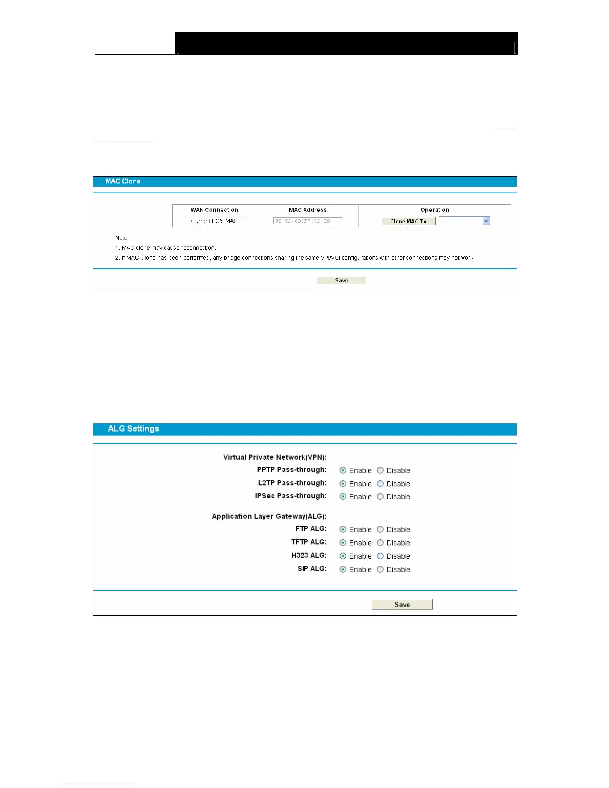 Choose menu “Network”“MAC Clone”, you can configure the MAC address of the WAN