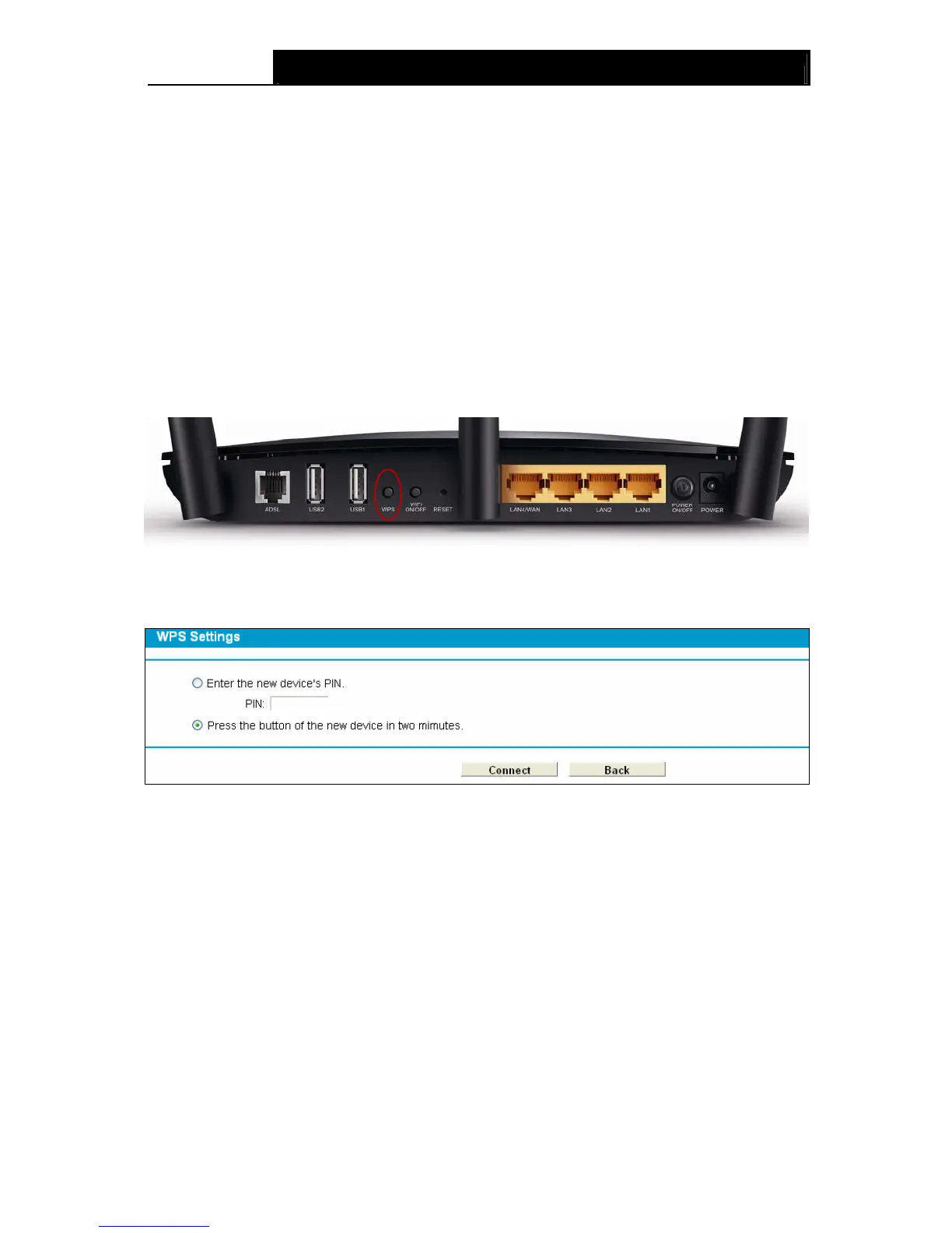 Step 1: Press the WPS button on the back panel of the modem router, as shown in the following