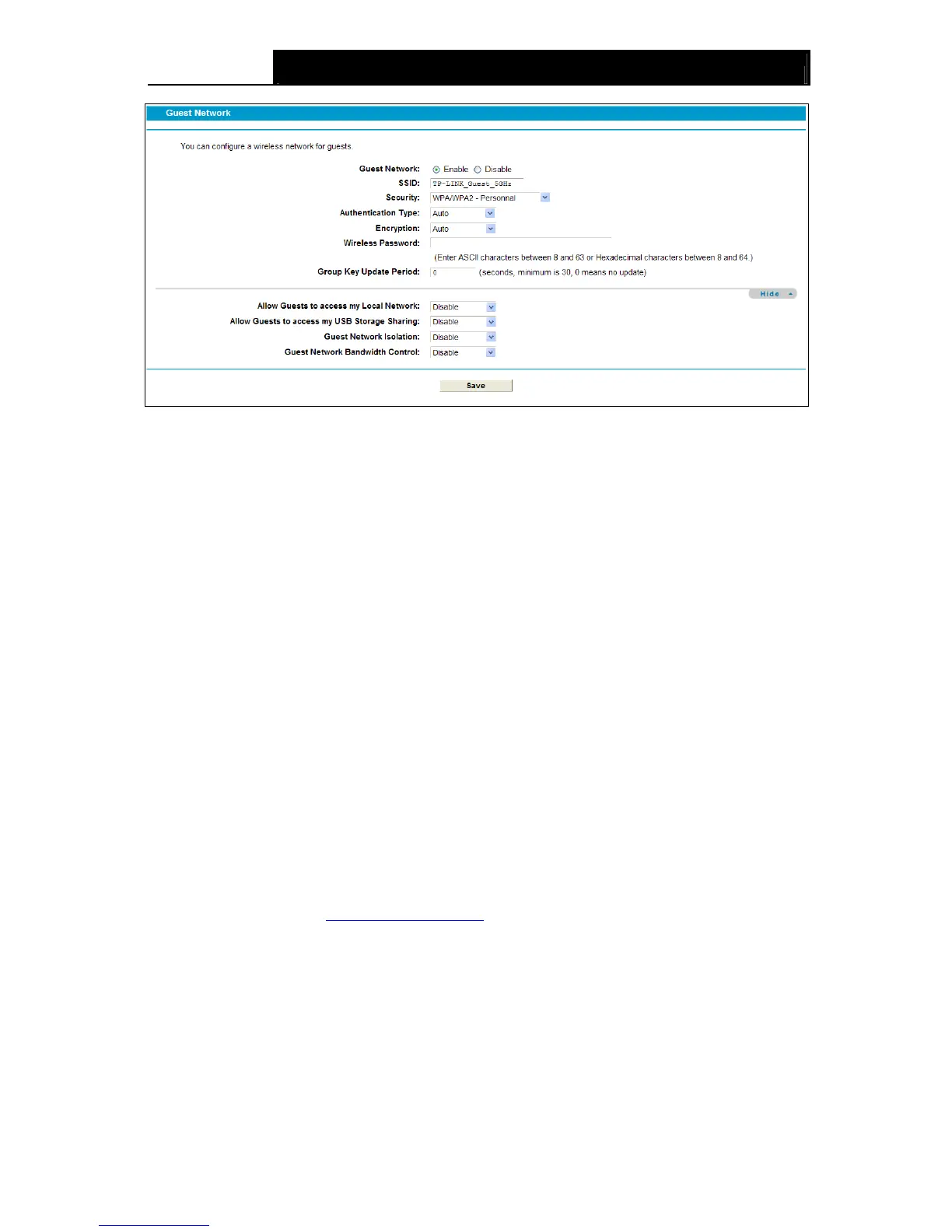 Guest Network: When enable this function, you can set wireless parameters for guest