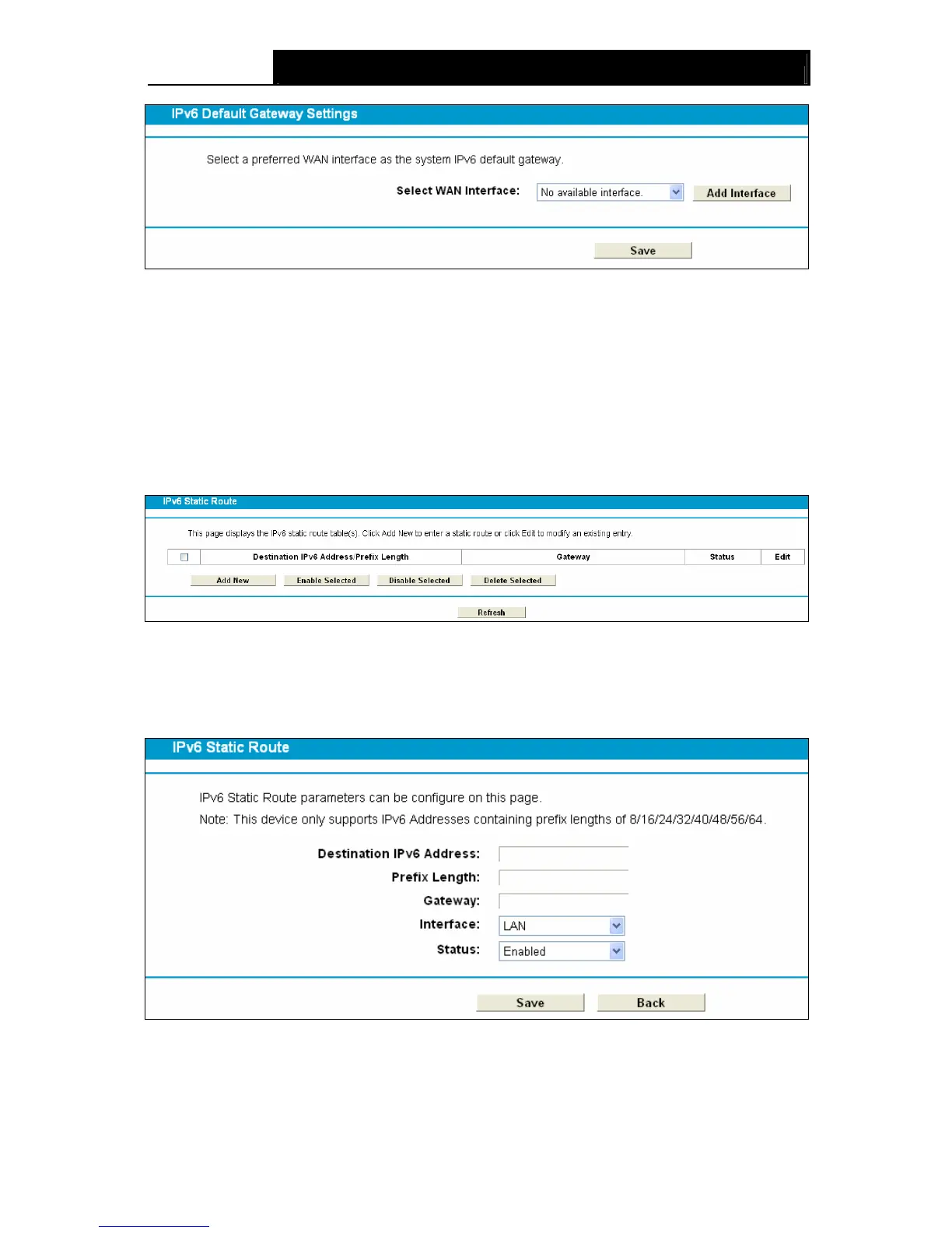 Choose “IPv6 Route Settings” “IPv6 Static Route”. You can see the IPv6 Static Route screen.