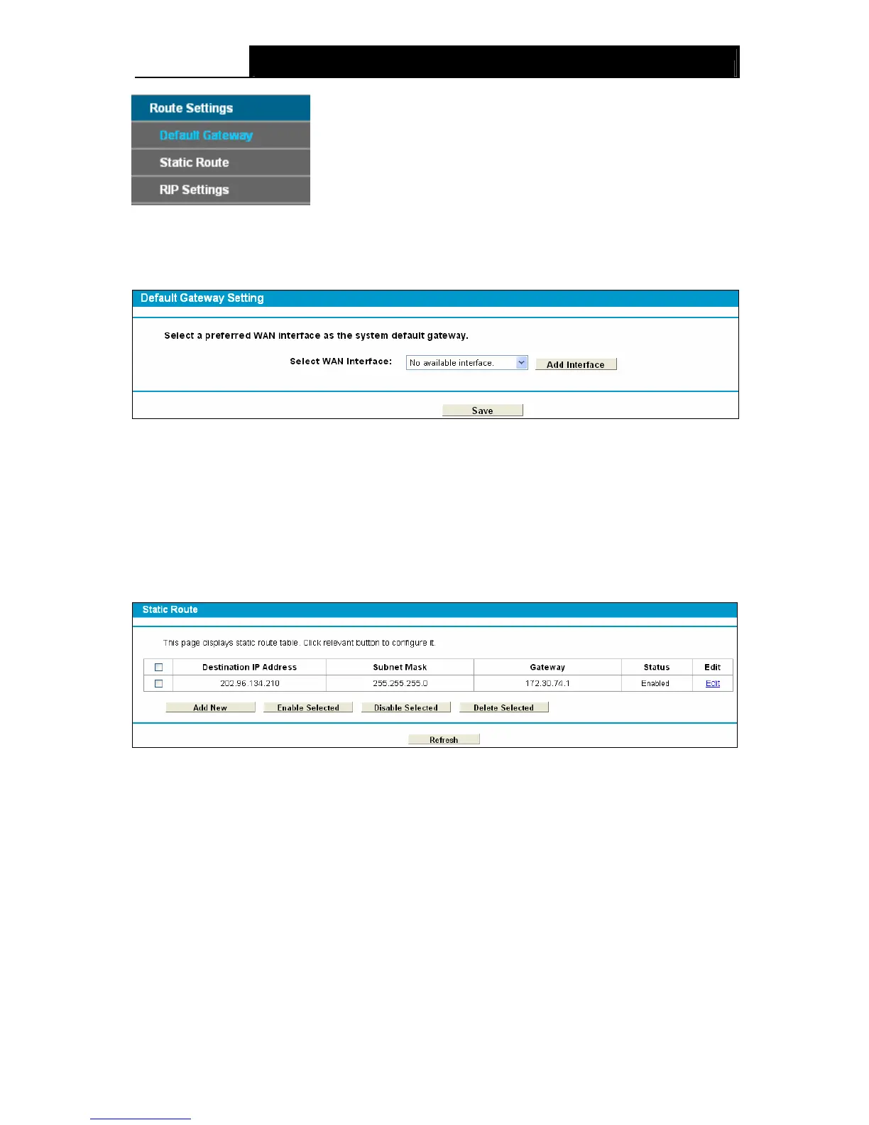 Choose “Route Settings”“Default Gateway”, you can see the Default Gateway screen. You