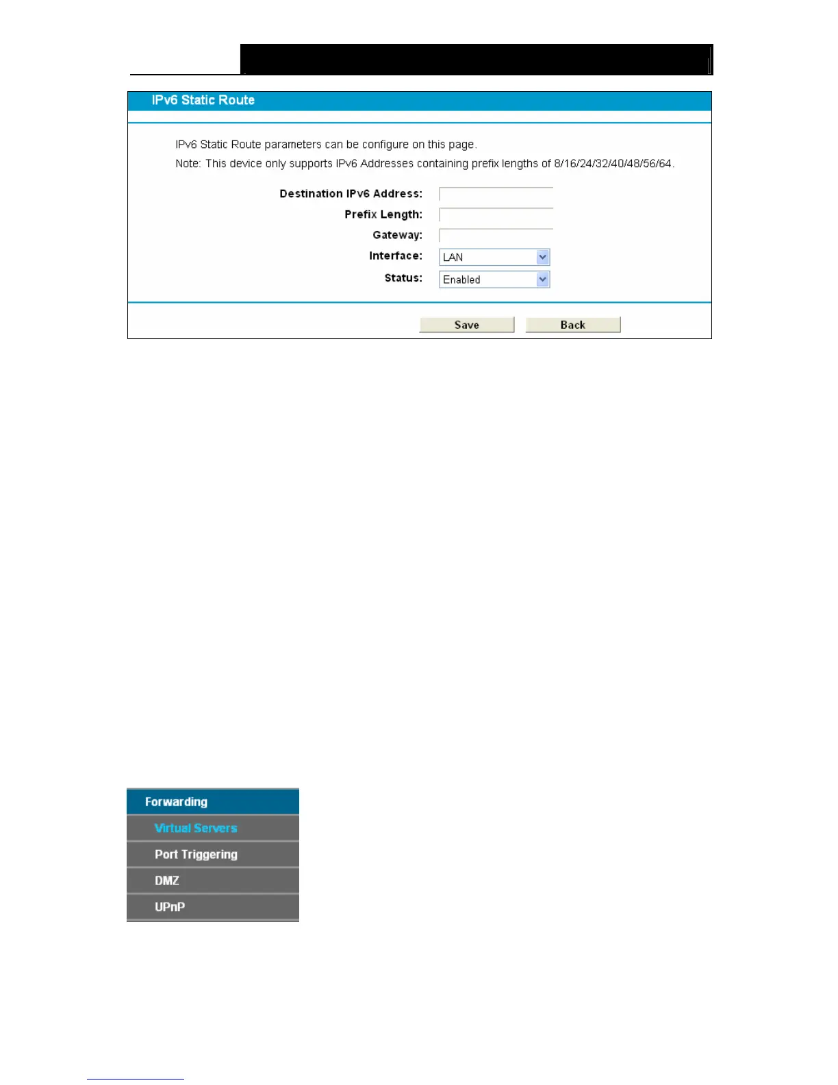 There are four submenus under the Forwarding menu: Virtual Servers, Port Triggering, DMZ