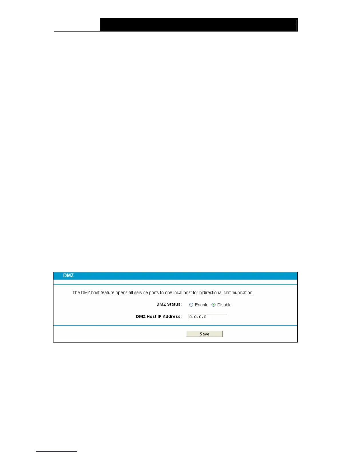 Choose menu “Forwarding→DMZ”, and then you can view and configure DMZ host in the screen