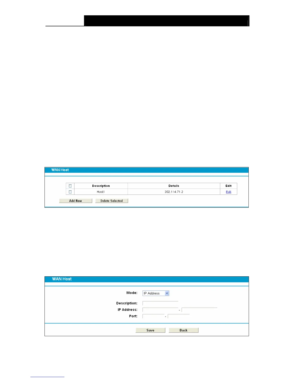 Choose menu “Firewall” → “WAN Host”, and then you can view and set a Host list in the screen