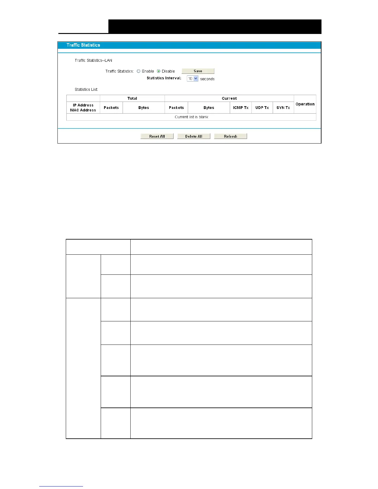 Traffic Statistics: If it is disabled, the function of DoS protection in Security settings will be
