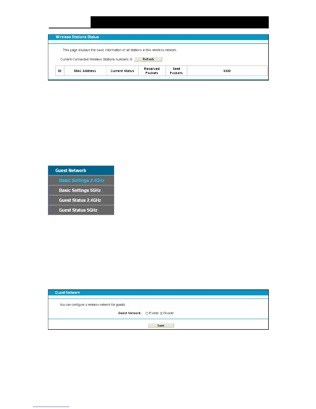 There are four submenus under the Guest Network menu: Basic Se ttin gs 2.4GHz, Basic