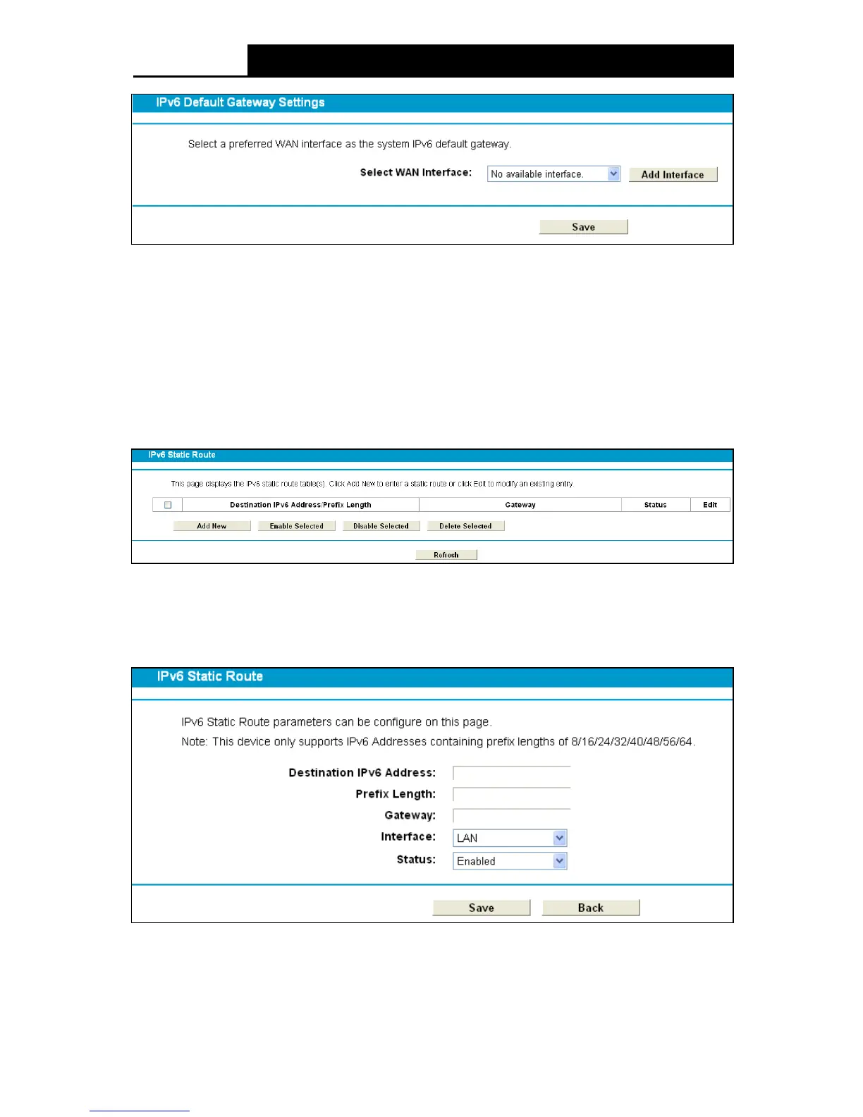 Choose “IPv 6 Route Se ttings” “IPv6 Static Route”. You can see the IPv6 Static Route screen.