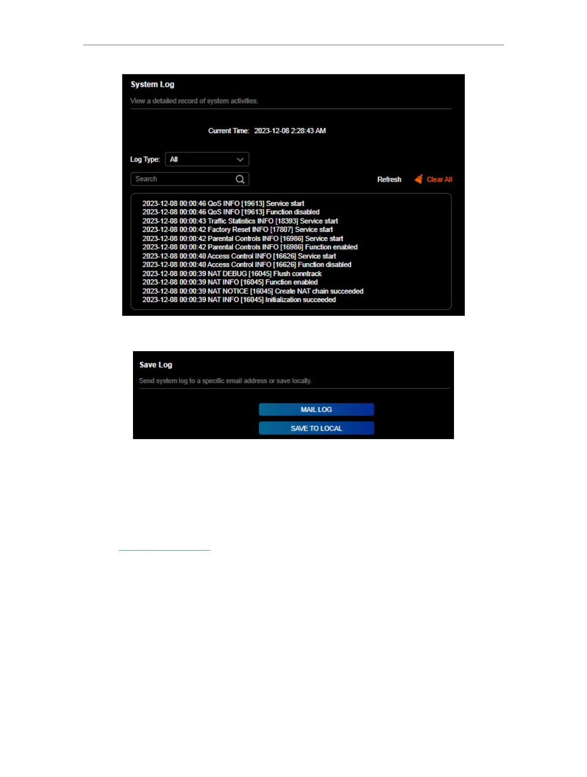 4. In the Save Log section, click SAVE TO LOCAL to save the system logs to a local disk.