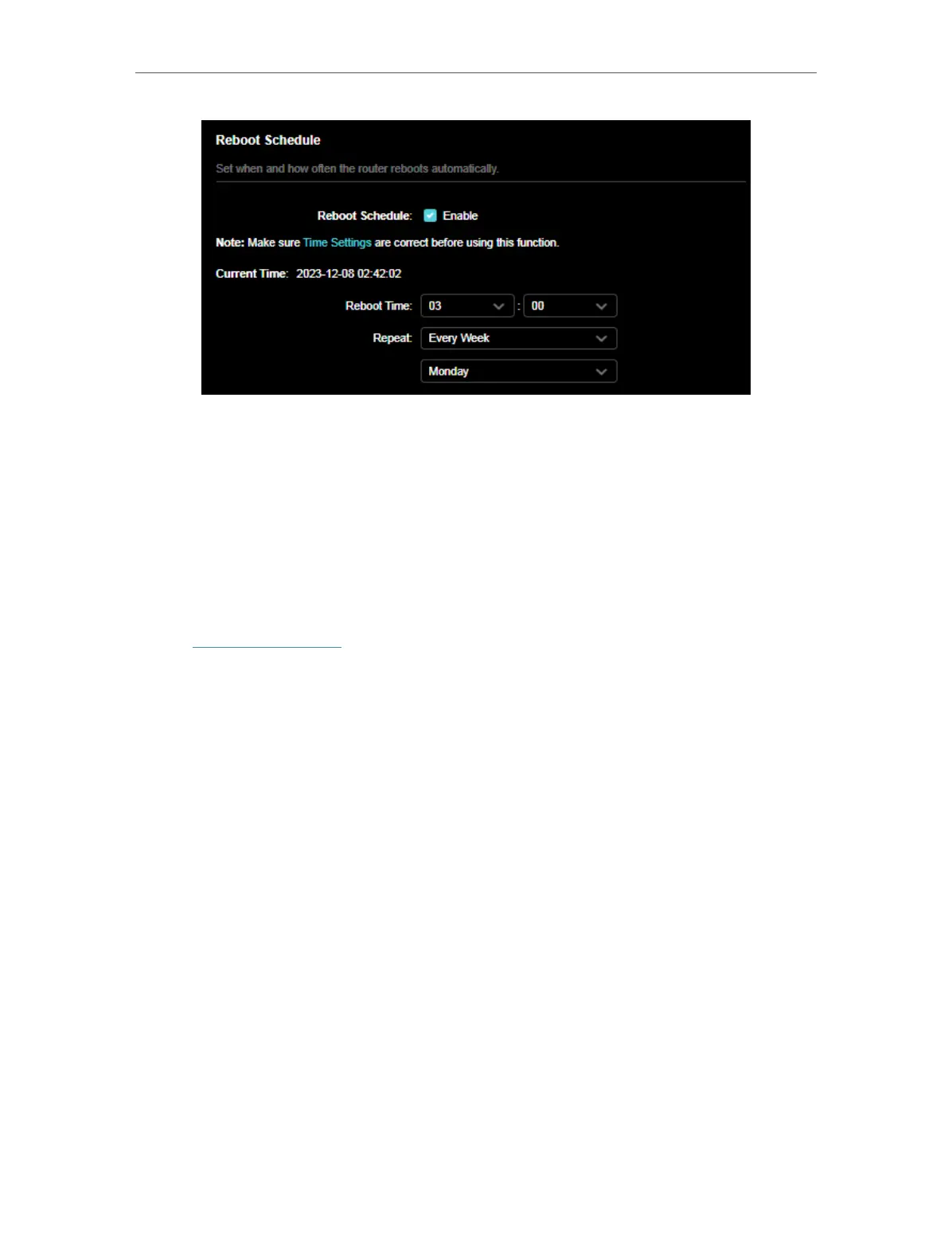 4. Specify the Reboot Time when the router reboots and Repeat to decide how often it