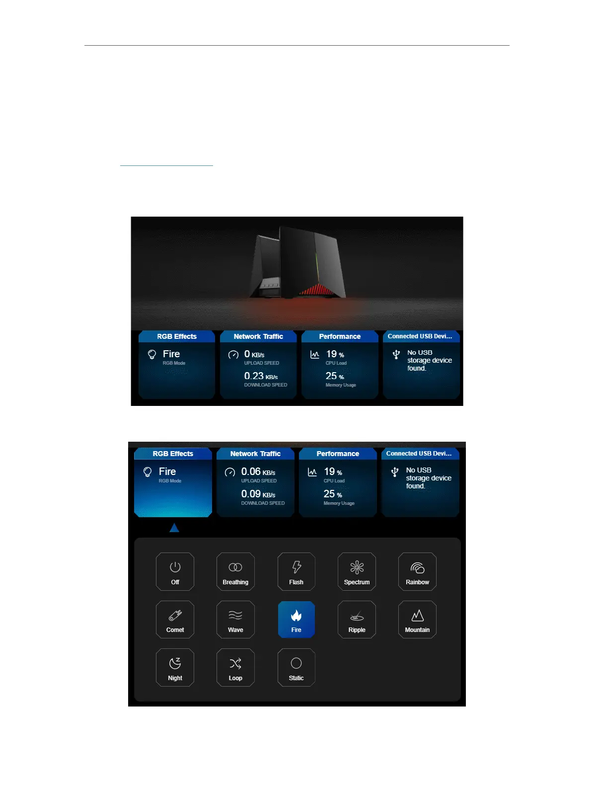 network traffic of the WAN port, Performance of the router, and connected USB devices.