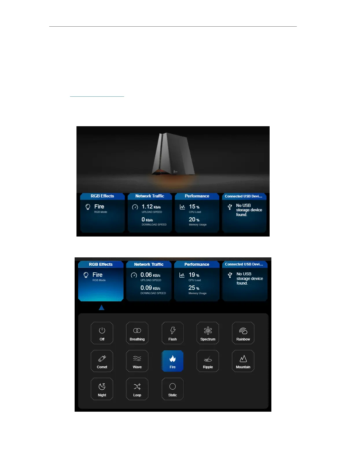 Here you can check key parameters related to your router, including the RGB effects,