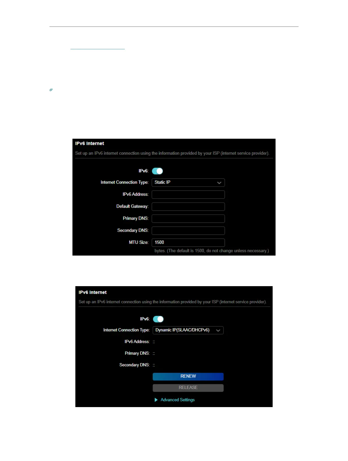 2 ) Dynamic IP(SLAAC/DHCPv6): Click Advanced Settings to input further